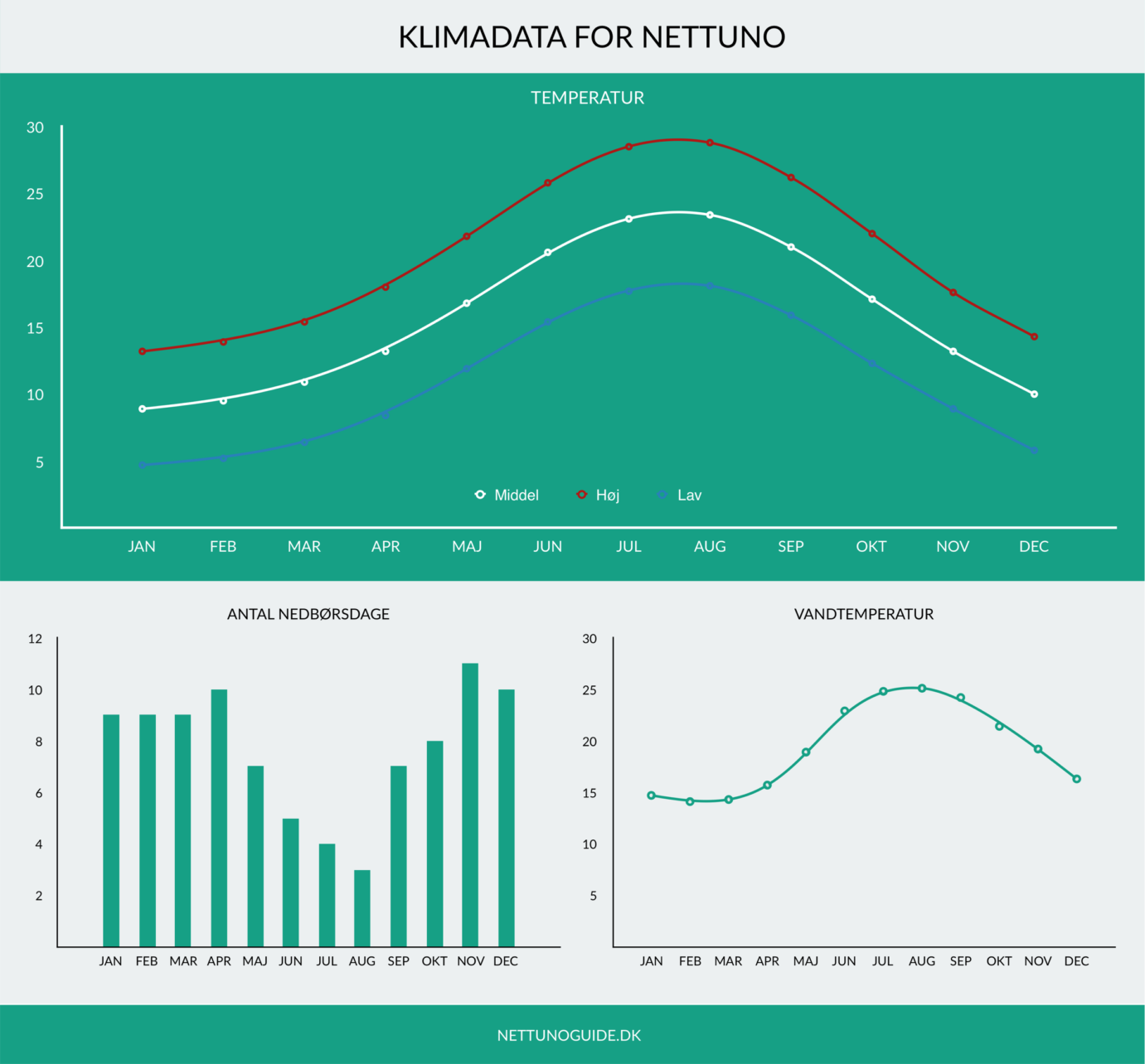 Nettunos klima er præget af varme solrige somre med lidt nedbør, og forholdsvis milde vintre med en del nedbør. De varmeste måneder er juli og august og de koldeste måneder er januar og februar. Vi har lavet en grafisk oversigt øverst.